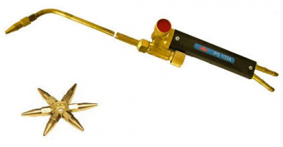 Palnik ręczny PS-103A w opakowaniu kartonowym. Przeznaczony do spawania acetylenowo-tlenowego. Zakres grubości spawania do 4 mm.